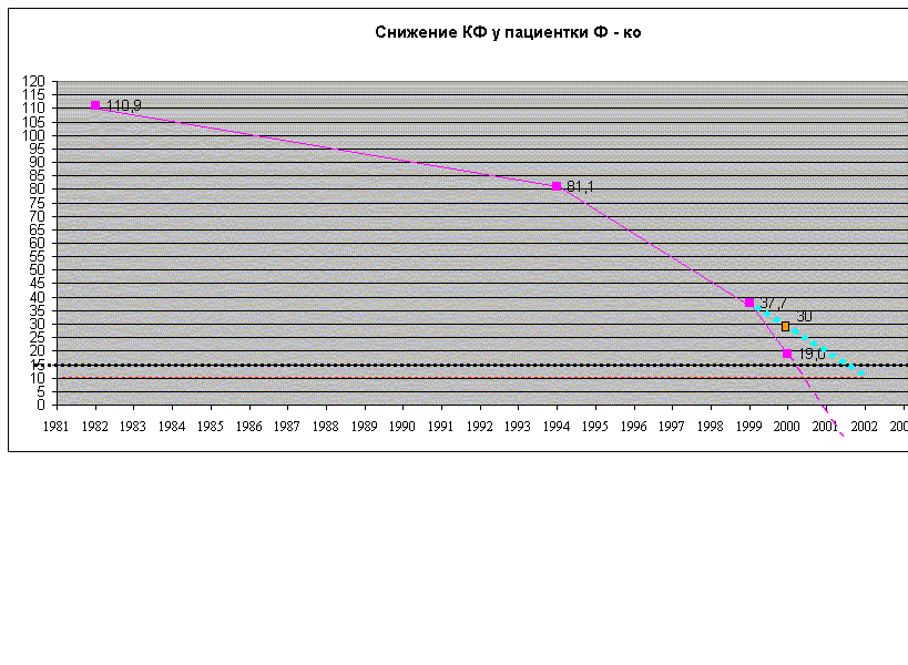 Вот еще иллюстрация необходимости мониторирования снижения клубочковой фильтрации, хотя тут фильтрация понижалась нелинейно. Это тоже мое собственное наблюдение. Пациентке Р. в 2004 году исполнилось 74 года, уже 4 года она находится на диализе. Наблюдение начато, когда пациентке было 50 лет. Диагноз хронического пиелонефрита не подтвержден биопсией, однако не вызывал сомнений в связи с яркой клинической картиной. Клубочковая фильтрация определялась в основном после обострений уроинфекции. При КФ =15мл/мин создан сосудистый доступ, при КФ= 10 мл/мин начат программный гемодиализ. Первоначальные прогнозы тангенса угла снижения КФ не оправдывались и функция снижалась быстрее (голубая линия - предсказанный график снижения, малиновая - фактический график снижения. Посмотрите, при последнем посещении ожидался уровень СКФ = 30 мл/мин, а оказался 19 с небольшим!)