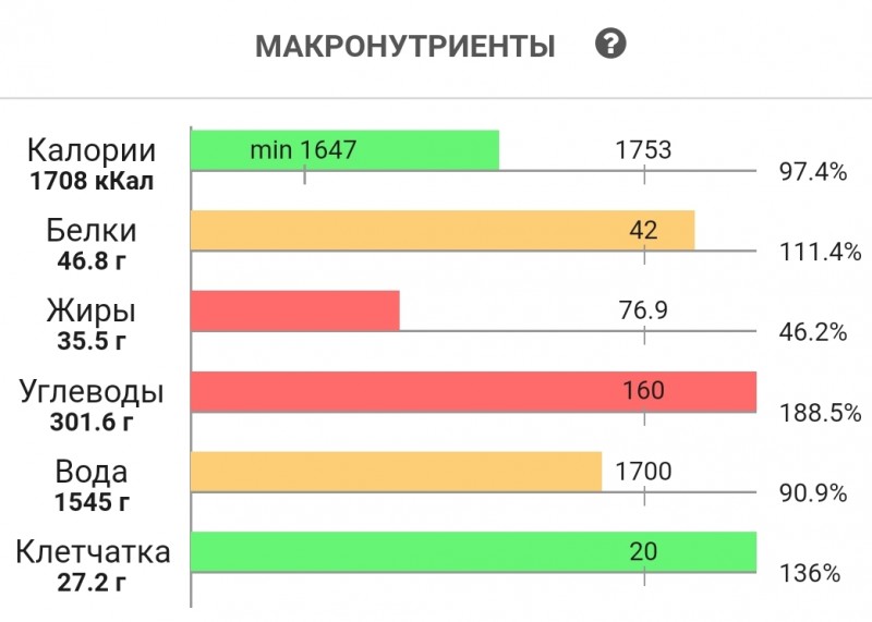 Прочитал работу "Проект клинических рекомендаций по питанию больных на додиализных стадиях" Там написано, чтоб МБД ( 0,6-0,3 г белка/кг/сут) не приводили к катаболизму собственных белков организма, необходимо потреблять не менее 35 ккал/кг в сутки. Проанализировав, в связи с этим, свой дневник питания, понял, что я не добираю по калориям. На мой вес в 65 кг необходимо набирать 2275, а я набираю в среднем 1700-1800. Прикладываю скрины из дневника, один из моих дней. Пока не могу понять как, мне скорректировать питание, чтоб добрать эти калории. На диаграмме есть проблема с добором суточных жиров. Какие продукты можно добавить в рацион, чтоб прибавить жиров, и не перевалить по белкам, ну и подтянуть калории до нормы?