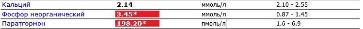 По поводу рокальтрола , я узнала ,что это тоже самое ,что и альфа Д3. После приема Альфы Д3 пересдала анализы: мочевина 18.2 (2.8-7.8) мочевая кислота 382(155-357) креатинин 260 (58-96) альбумин 46 (35-52) ревмофактор 12.7 (0-30) холестирин 6.17 (3-5.2) щелочная фосф 94 (30-120) кальций общ 2.51(2.1-2.65) фосфор 1.48 (0.81-1.45) HDLхолестирин 1.6 (1.15-2.5) LDL холестирин 4.03 (2,6-3,3) коэф атер 2.9 ( до 3) с-реакт белок 1.1 калий 5.8 (3.5-5.5) Алексей Юрьевич ,ферретинин я пересдала 48 (10-120), трансферрин 2.1 (2-3.6), железо 8.3 (9-30) Все время был высокий ферритинин ,около 500, сейчас 48 ,может прием Альфы Д3 его понизить Паратгормон 139 (12-65)