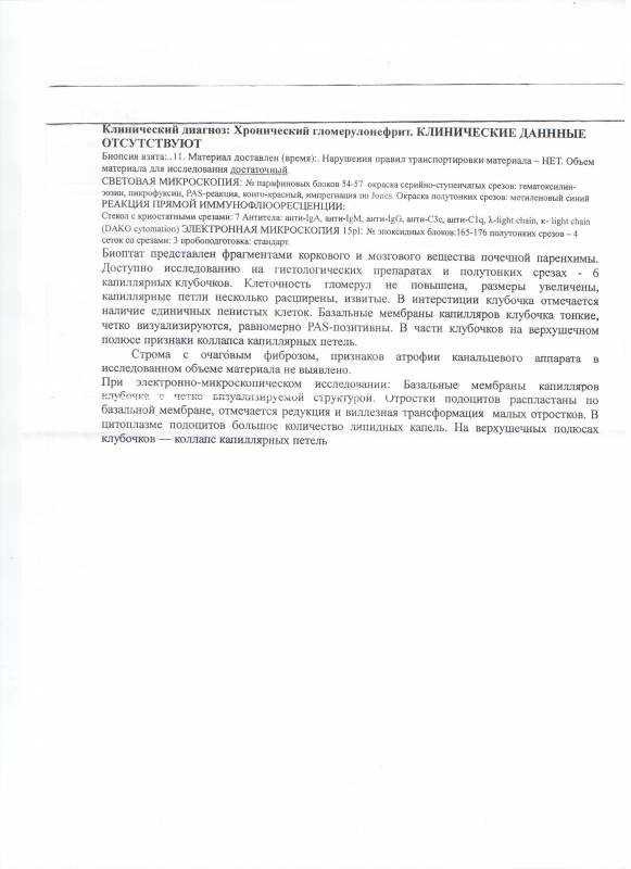 Здравствуйте Алексей Юрьевич. Это все что есть. Биопсию делали в г. Челябинск, живу я в Казахстане. Там мне после биопсии на прощание сказали , что у меня Липоидный нефроз (т.е минимальные изменения),. только через время мне пришло это исследование, с другим заключением. Получилось на словах одно, на бумаге другое. В общем консультации я не получила, в качественности биопсии усомнилась. Прошу Вас оценить состояние моих почек по этим данным.