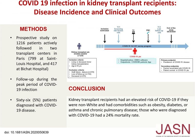 Although studies have found coronavirus disease 2019 (COVID-19) to be associated with high morbidity and mortality among kidney transplant recipients, risk factors for COVID-19 among kidney transplant patients remain poorly defined. In this prospective cohort study in France, the authors enrolled 1216 kidney transplant patients, 66 (5%) of whom were diagnosed with COVID-19. The mortality rate associated with COVID-19 for the overall study population was 1% and 24% among COVID-19–positive patients. Factors that were independently associated with COVID-19 included non-White race and comorbidities, including obesity, diabetes, and asthma and chronic pulmonary disease. In the context of COVID-19, it is imperative that policy makers integrate information about risk factors to help clinicians balance benefits and risks and better advise patients about potential risks.