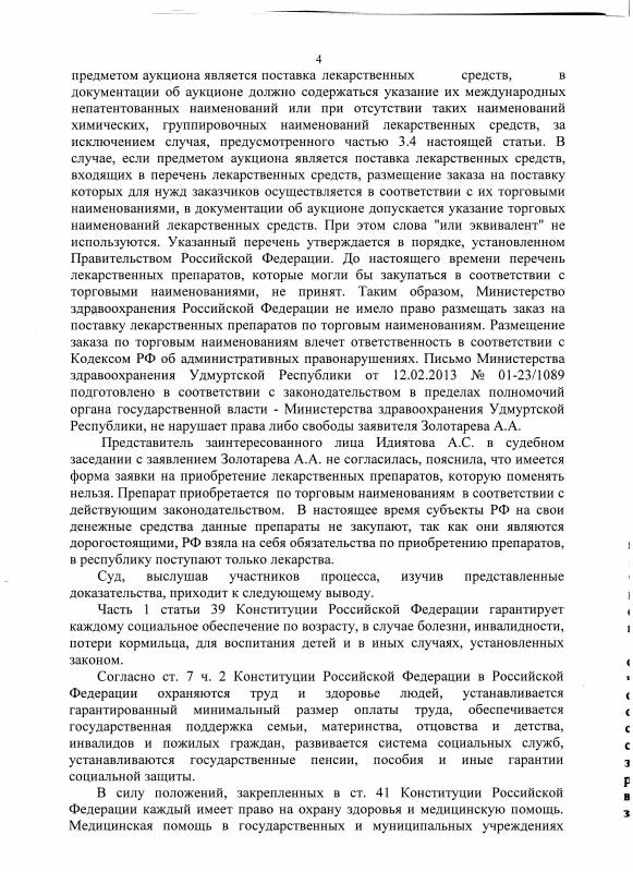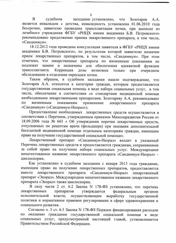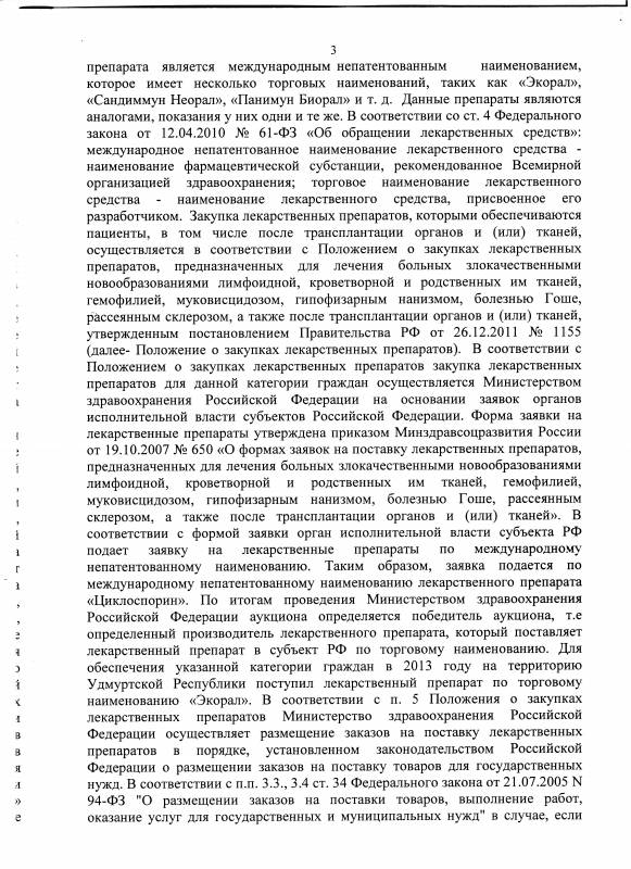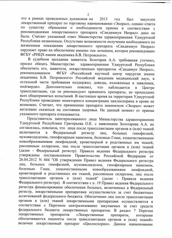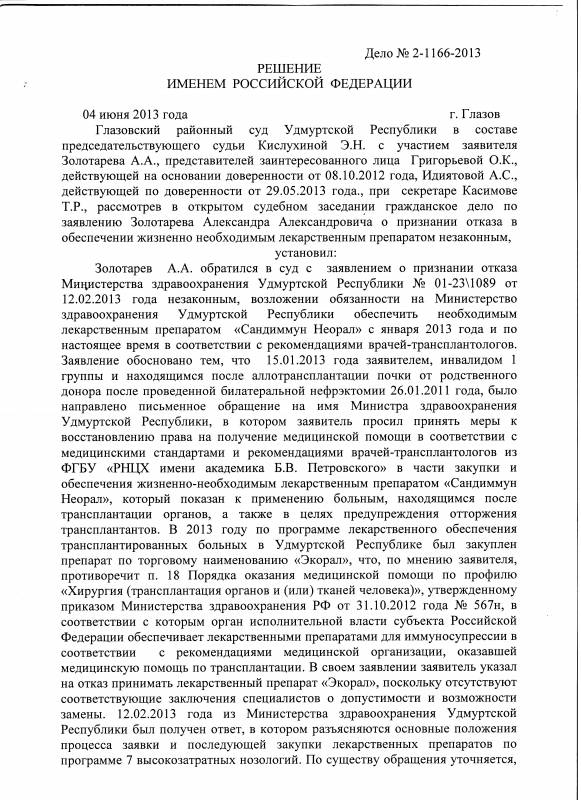 ЗАЯВЛЕНИЕ о признании незаконным отказа в обеспечении жизненно необходимым лекарственным препаратом (в порядке главы 25 ГПК РФ) В соответствии с пунктом 14 Постановления Пленума Верховного Суда РФ от 10.02.2009 №2 «О практике рассмотрения судами дел об оспаривании решений действий (бездействия) органов государственной власти, органов местного самоуправления, должностных лиц, государственных и муниципальных служащих», частью 2 статьи 254 ГПК РФ заявление подается по месту жительства истца. 15 января 2013 года мной, Золотаревым Александром Александровичем, инвалидом _____ группы и находящимся после аллотрансплантации почки от родственного донора после проведенной билатеральной нефрэктомии 26 января 2011 года, было направлено письменное обращение на имя министра здравоохранения Удмуртской Республики Музлова Владимира Михайловича, в котором я просил принять меры к восстановлению моего права на получение медицинской помощи в соответствии с медицинскими стандартами и рекомендациями врачей-трансплантологов из ФГБУ «РНЦХ имени академика Б.В.Петровского», в части закупки и обеспечения меня жизненно необходимым лекарственным препаратом «Сандиммун Неорал». Данный лекарственный препарат показан к применению больным, находящимся после трансплантации органов, а также в целях предупреждения отторжения трансплантатов. В 2013 году по программе лекарственного обеспечения трансплантированных больных (Далее – «Программа 7 высокозатратных нозологий») в Удмуртской Республике был закуплен препарат по торговому наименованию «Экорал». Считаю, что это противоречит пункту 18 Порядка оказания медицинской помощи по профилю «Хирургия (трансплантация органов и (или) тканей человека)», утвержденному Приказом Министерства здравоохранения РФ от 31.10.2012 года №567н. В соответствии с данным положением, орган исполнительной власти субъекта Российской Федерации обеспечивает лекарственными препаратами для иммуносупрессии в соответствии с рекомендациями медицинской организации, оказавшей медицинскую помощь по трансплантации. В своем обращении, а также в амбулаторной карточке, оформленной в БУЗ УР «Первая РКБ МЗ УР», я указал на зафиксированные мной письменные отказы принимать лекарственный препарат Экорал», поскольку отсутствуют соответствующие заключения специалистов о допустимости и возможности замены. Имеются соответствующие записи в амбулаторной карточке от 14 января и 7 февраля 2013 года. 12 февраля 2013 года был получен ответ на мое обращение из Министерства здравоохранения Удмуртской Республики, в котором подробно разъясняются основные положения процесса заявки и последующей закупки лекарственных препаратов по Программе 7 высокозатратных нозологий. По существу моего обращения уточняется, что в рамках проведенных аукционов на 2013 год был закуплен лекарственный препарат по торговому наименованию «Экорал». Однако, ответа по существу обращения о необходимости приема в соответствии с рекомендациями лекарственного препарата сандимон-неорал, в ответе министерства здравоохранения Удмуртской республики так и не дано. Считаю, что указанный ответ Министерства здравоохранения Удмуртской Республики нарушил мое право и является незаконным по следующим основаниям. Согласно статье 41 Конституции Российской Федерации каждый имеет право на охрану зд