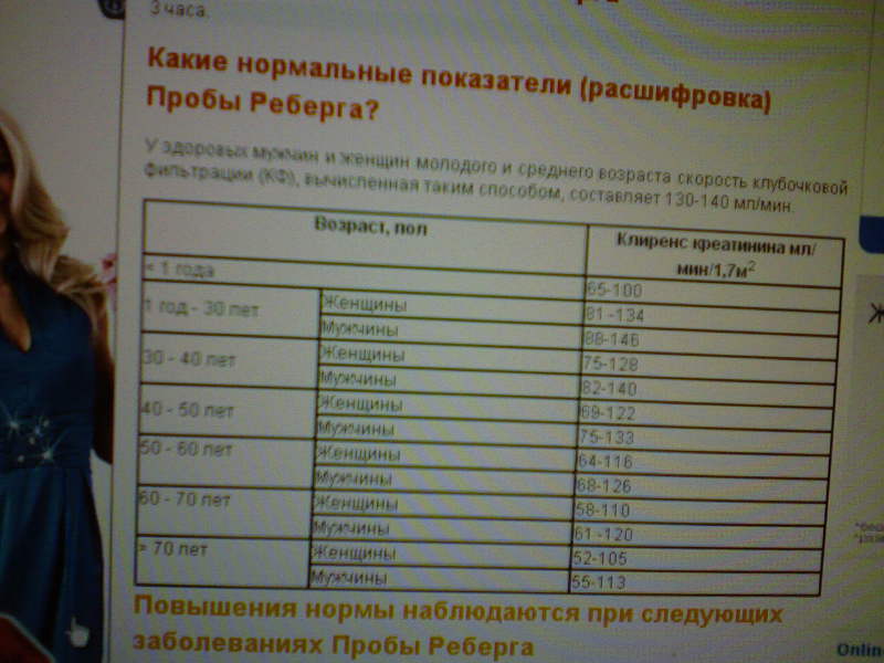 Здравствуйте1 Пробу Реберга сделать не успела Но ищу успокоения и нашла такую таблицу по клиренсу креатинина Меня она немного успокаивает Но так ли это,,,,,,, могут ли давать какую!то полезную информацию анализы с тест полосками на креатинин и альбумин в моче Какая норма креатинина в моче 7