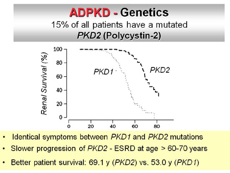 Quote (Вероника) дедок 80 лет с поликистозом, еще не на диализе. Так, Вероника, бывают разные мутации в разных генах, срок наступления терминальной ХПН от этого зависит, вот картинка из лекции G. Walz :