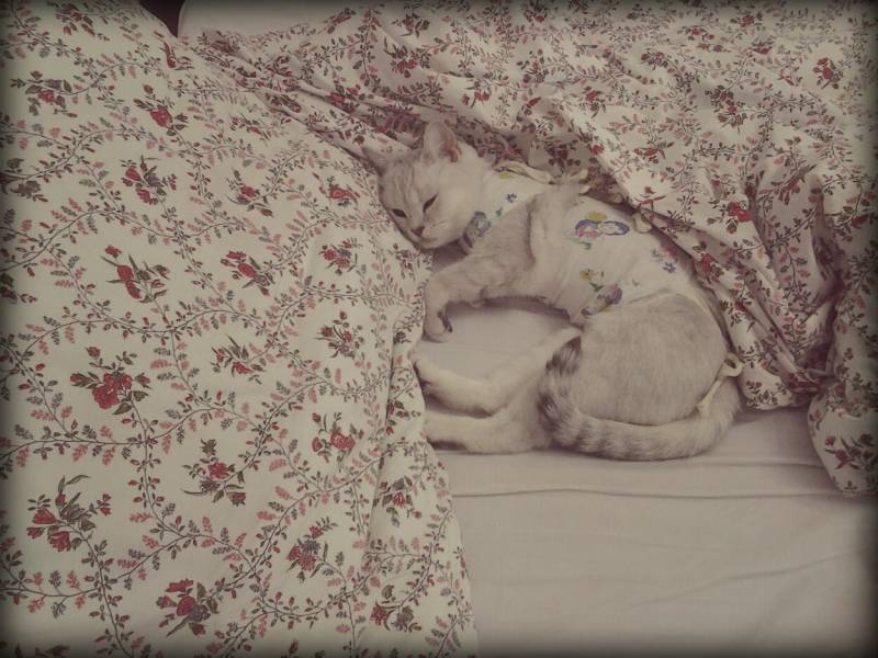 Швы сказали придти на 10й день снимать. Хочется глянуть что там за шов у нее, но она к животу не подпускает, даже лапы задние трогать не дает, страдальчески стонать начинает. Наверно все таки больно.