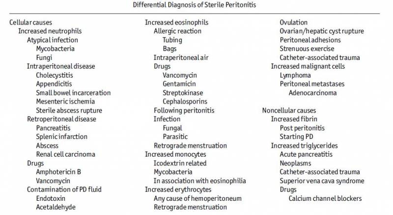 Далее :Szeto и соавт. показал, что 45% случаев стерильного перитонита были связаны с техническими трудностями при сборе образцов, а 26% стерильности были связаны с приемом антибиотиков в течение предыдущих 30 дней.