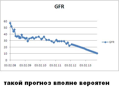 Quote (Dzmitry) у меня самого сейчас такая же беда, с 26-го декабря начался жуткий кашель,потом сопли, на НГ была температура (что-то вроде кризиса-так как после этого слегка полегчало).Сегодня нашел в себе силы выбраццо к врачу.то послушал и сказал.что это бронхит....в итоге болею целую неделю, все новогодние планы пошли сами понимаете куда (хорошо,что Рождество удалось встретить))))Давно уж так не болел да и НГ такого что-то не припомню.... Сегодня по горячим следам сдал тест и в итоге креатенин подрос до 266, а СКФ упала до 22. И мой образцово-показательный график стал выглядеть теперь вот так Похоже,что имеет смысл озаботиться формированием фистулы где-то в первой половине этого года (а может быть и в марте,как планировалось)