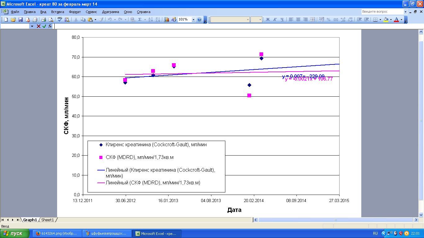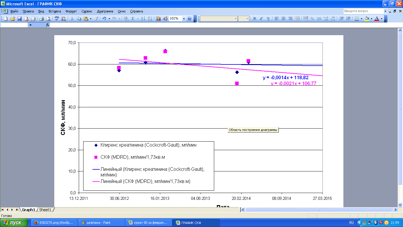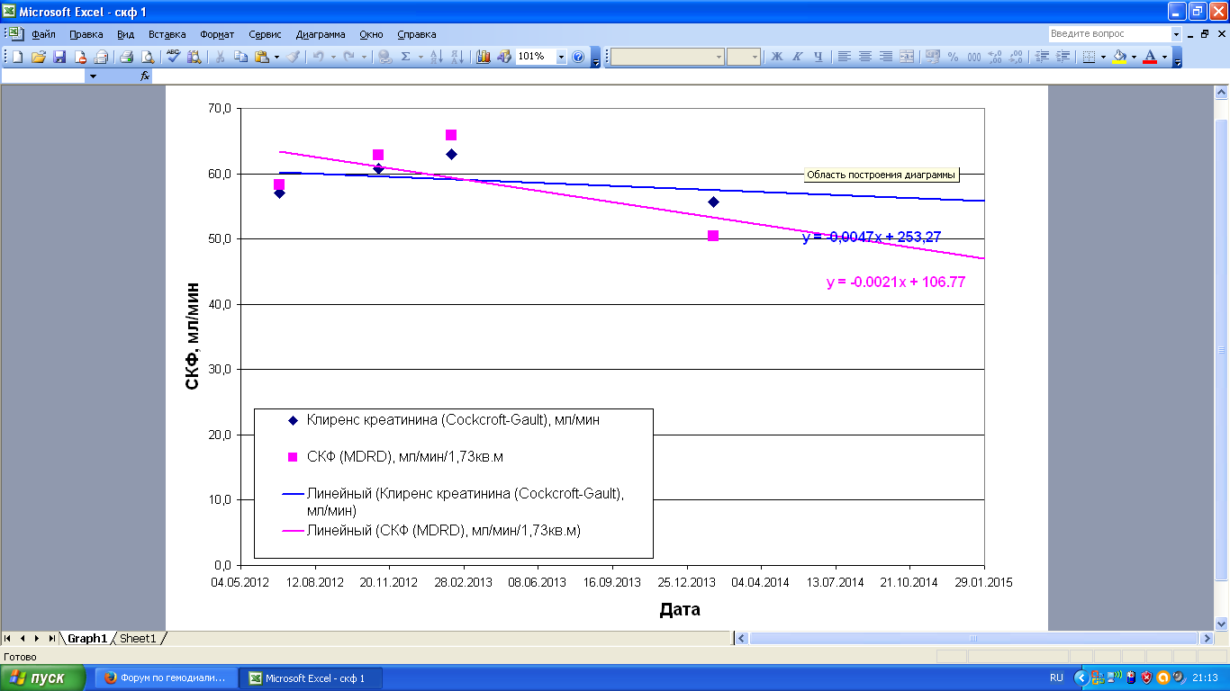 Цитата Elena67 (  ) У меня вопрос - каким графиком мне пользоваться в дальнейшем Елена, как написал Алексей Юрьевич, из этих графиков мало чего можно сейчас понять. Почему-то оценка СКФ в крови прыгает, то ли из-за лабораторных ошибок, то ли уровень креатинина в крови в самом деле прыгает. Цитата Elena67 (  ) Самые низкие значения СКФ - это районная поликлиника, а все остальное = стационар и Инвитро. Тогда, возможно, в районной поликлинике неточно измеряют уровень креатинина. А Вы в табличке заполняйте еще один столбец, с указанием лабборатории, где анализ делали.