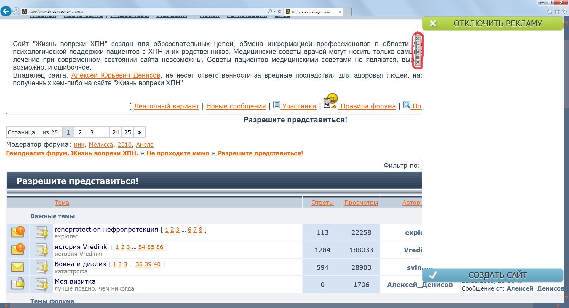 Владелец сайта, Алексей Юрьевич Денисов, не несет ответственности за вредные последствия для здоровья людей, наступившие в результате советов третьих лиц, полученных кем-либо на сайте "Жизнь вопреки ХПН"