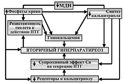 2)Стимуляция выработки ПТГ вследствие гипокальциемии, снижения выработки кальцитриола, гиперфосфатемии
