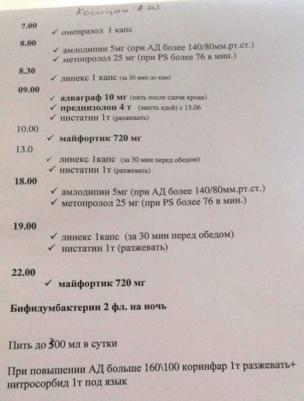 Юля, не я это придумал. Почти всем прописали метипред, а мне - преднизолон. Всё, кроме адваграфа, преднизолона и мофетила (майфортик) мне отменили. Преднизолон снизили до 2 т. Адваграф меняют от концентрации Добавили Вальцит 450 мг/ через сутки