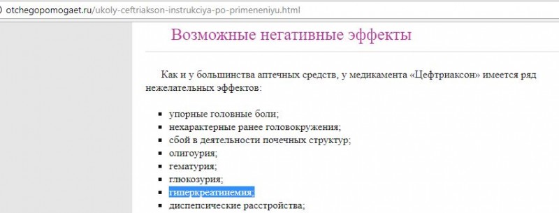 Для тех , "кто никогда не видел ГИПЕРКРЕАТИНИМИЮ" - http://vlanamed.com/tseftriakson-instruktsiya-po-primeneniyu/ , http://otchegopomogaet.ru/ukoly-c....yu.html