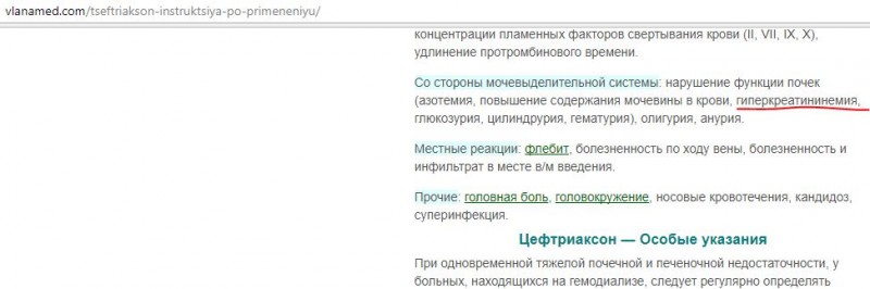 Воспаление легких мужу лечили тоже цефтриаксоном (креатинин поднимался до 512). Я не говорю, что это плохой антибиотик. Я обращаю внимание, что даже он дает в побочках ГИПЕРКРЕАТИНИМИЮ. Не у всех, безусловно.
