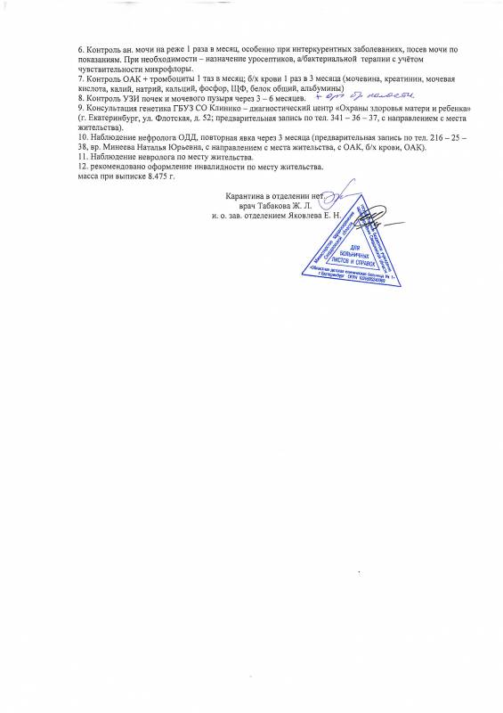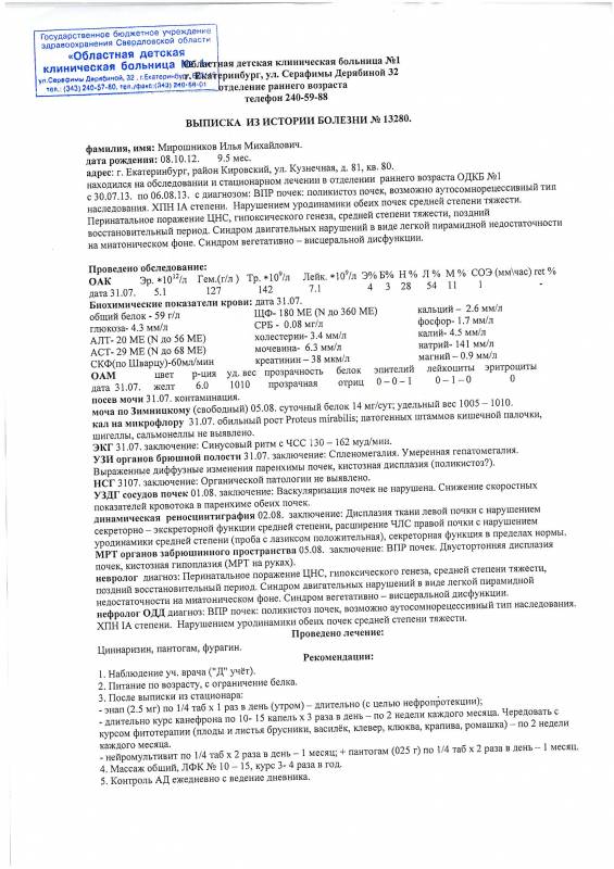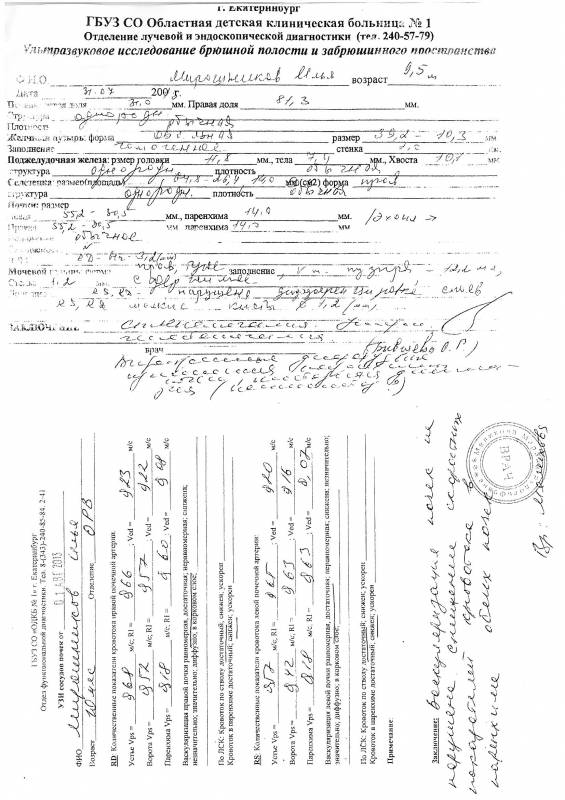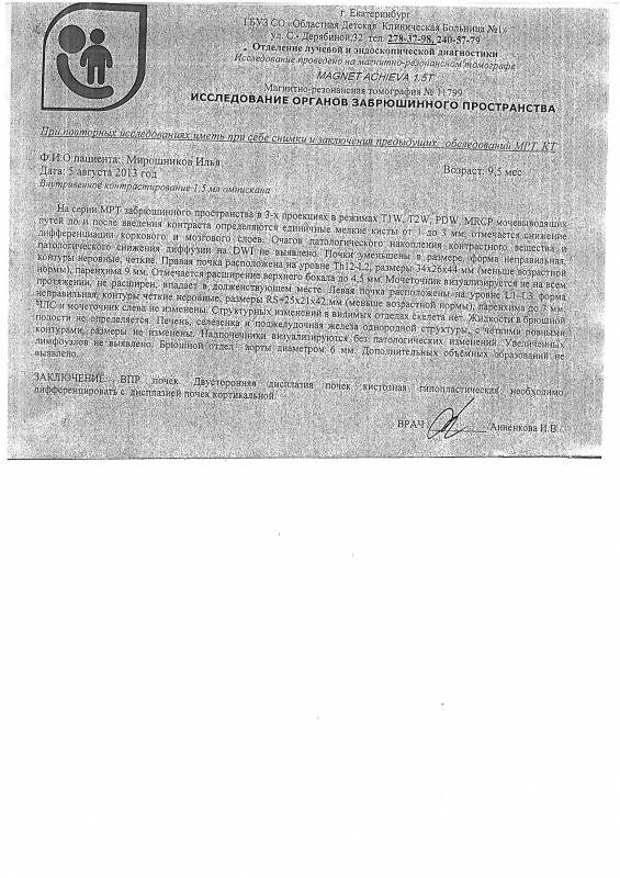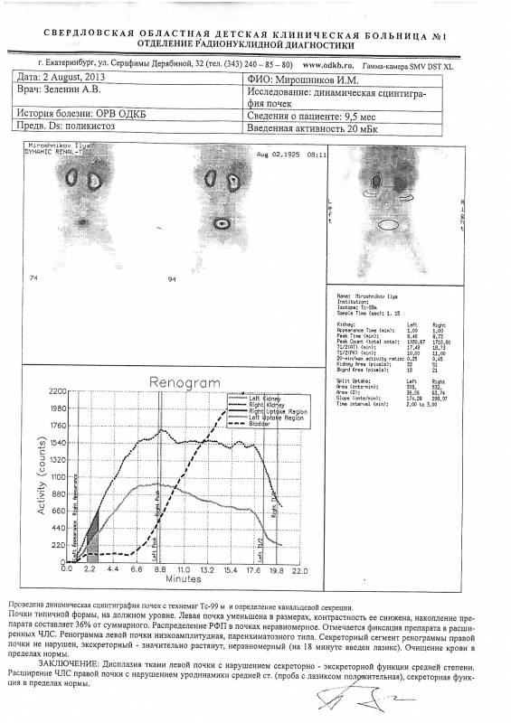 Здравствуйте! Как-то незаметно пролетели последние два года. В прошлом году нефролог думала оформить инвалидность ребенку, положили на обследование функции почек. Анализы были все хорошие, единственное у нас очень много оксалатов. К моей радости, для инвалидности пока нет оснований. В этом году мы легли снова на обследование. Урографию и цистоскопию ему делать не стали (делали только в 10 месяцев), сказали, что учитывая его патологию делать эти обследования не стоит. По анализам говорят, что все в норме, единственное, опять оксалатов много - 35 (единицы не указаны). Вообще биохимия мочи такая: оксалаты, 35, кальций 1,1, амиак - моча щелочная, кристаллурия пол. (++) Делали узи. Почки обычных размеров:8,1х3,6х3,4 - правая, 8,2х3,1х3,1 - левая. Множественные кисты и справа и слева от 0,3-0,4 см до 1,0-1,5 см. В заключении написано: в целом эхокартина прежняя (в сравнении с предыдущим исследованием). Экопризнаки поликистоза почек (тип?) по эхоакртине (что-то тут написано непонятное) большие "+" за доминантный? (учитывая достаточно хорошую (КМД вроде написано), по типу кист - рецессивный? Отмечается умеренное повышение эхогенности печени. Нами на этот раз заинтересовался уролог и направил на компьютерную томографию. Вот ее результаты. "На томограммах форма, размеры и положение печени не изменены. Контуры ровные, четкие. Структура паренхимы однородная, плотность ее не изменена. Внутри и внепеченочные желчные протоки не расширены. Очаговых изменений послевнутривенного болюсного контрастного усиления не выявлено. Надпочечники обычной формы и размеров, однородной структуры. Почки расположены правильно, размеры: правая 76х40 мм, левая 70х38 мм, контуры неровные, четкие. Верхний полюс правой почки представлен кистозными структурами, не накапливающими контрастное вещество, кортикальный слой резко истончен. Множественные кисты диаметром от 4 до 10 мм по остальным отделам обеих почек. Чашечно-лоханочная система обеих почек умеренно деформирована, не расширена, признаков конкрементов не выявлено. Паранефральная клетчатка без особенностей. Мочеточники не расширены. Функция почек сохранена" По всем остальным органам все нормально. Томограмма более достоверна, чем узи? Что можно сказать по результатам? Уролог отправляет нас еще на нефросцинтиграфию почек. С урологом общались только через нефролога (она карточку ему для ознакомления давала, он все это и назначил), лично к нему приходить только после этих всех обследований. Нефролог говорит, что будет решаться вопрос о пункции для облегчения состояния ребенка. Но на мой взгляд - у него нормальное состояние, он не жалуется, ттт, ни на боли в пояснице, ни на головные боли. На вид - самый обычный ребенок, хоть и гиперактивный, анализы тоже вроде как в норме. Мне кажется ему рановато ставить вопрос о пункции... А вы как думаете? Что даст эта нефросцинтиграфия? Не вредна ли он для ребенка и для его почек? В прошлом году не лезли к его почкам, кисты практически не увеличились (появились ли новые - не известно, говорят, что их не считают). Зато после урографии и цистоскопии размеры кист за год резко увеличились аж вдвое (самая большая была 0,7 мм, а потом стала 1,5 см (это по узи)). Не знаю, повлияли ли эти обследования на их рост или они сами по себе выросли, но мне кажется, что чем меньше к ним лезешь, тем спокойнее они себя ведут.