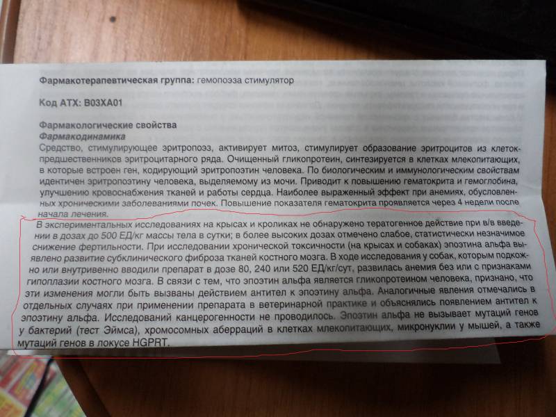 Quote В экспериментальных исследованиях на крысах и кроликах не обнаружено тератогенное действие при в/в введении в дозах до 500 ЕД/кг массы тела в сутки; в более высоких дозах отмечено слабое, статистически незначимое снижение фертильности. При исследовании хронической токсичности (на крысах и собаках) эпоэтина альфа выявлено развитие субклинического фиброза тканей костного мозга. В ходе 13 нед исследования у собак, которым п/к или в/в вводили препарат в дозе 80, 240 или 520 ЕД/кг/сут, развилась анемия без или с признаками гипоплазии костного мозга. В связи с тем что эпоэтин альфа является гликопротеином человека, признано, что эти изменения могли быть вызваны действием антител к эпоэтину альфа. Аналогичные явления отмечались в отдельных случаях при использовании препарата в ветеринарной практике и объяснялись появлением антител к эпоэтину альфа. Исследований канцерогенности не проводилось. Эпоэтин альфа не вызывает мутаций генов у бактерий (тест Эймса), хромосомных аберраций в клетках млекопитающих, микронуклии у мышей, а также мутаций генов в локусе HGRT. В период лечения, до установления оптимальной поддерживающей дозы пациентам с ХПН, необходимо соблюдать осторожность при вождении автотранспорта и занятии др. потенциально опасными видами деятельности, требующими повышенной концентрации внимания и быстроты психомоторных реакций (увеличение риска повышения АД в начале терапии). Эпокрин Международное наименование: Эпоэтин альфа (Epoetin alfa)