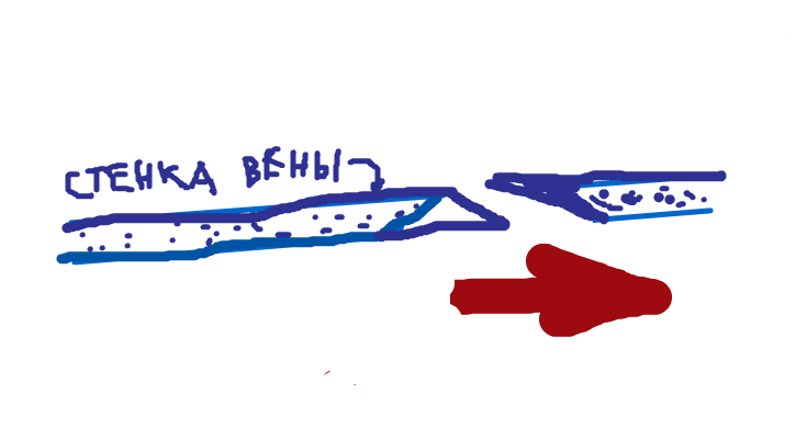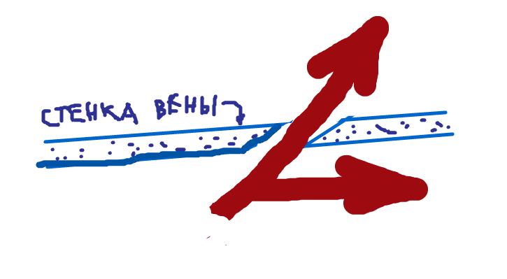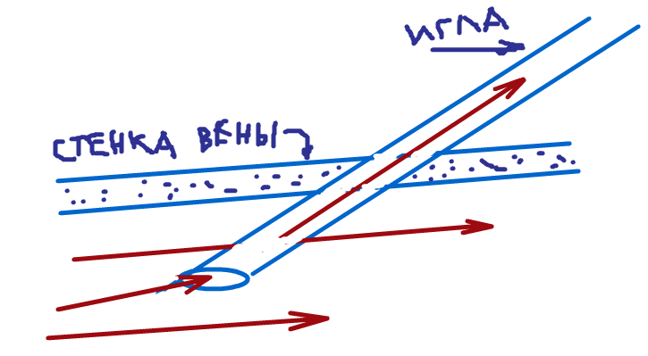 если игла расположена так: то после ее извлечения остается ход в стенке вены через который будет некоторое время продолжаться кровотечение (останавливается прижатием) если ход расположен так кровотечение остановится, якобы, быстрее. это технические проблемы, не фиксируйтесь на них...
